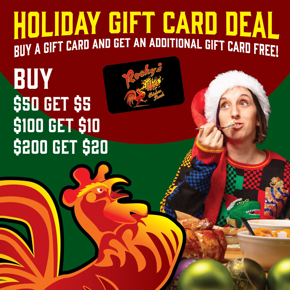 For anyone on your gift list, this is the perfect way of showing how much you care. Rocky’s Hot Chicken Shack Gift Cards ship via USPS and start at just $5! You can specify any amount you’d like and we’ll have it shipped the address you specify.